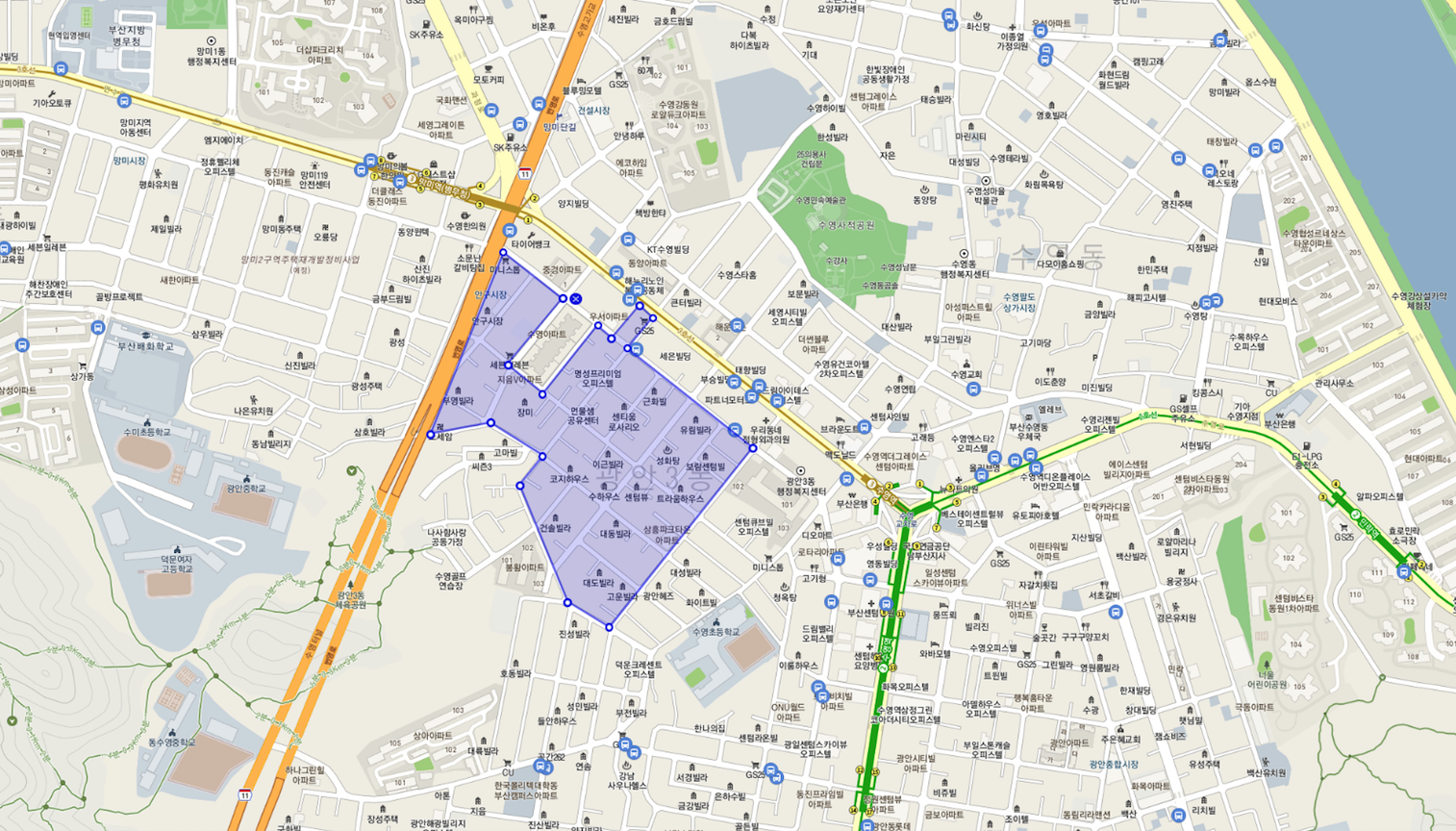 수영아파트가 이빨이 빠진 모양으로 향후 진행과정에서 편입되는 등의 변화가 있을수도 있습니다.