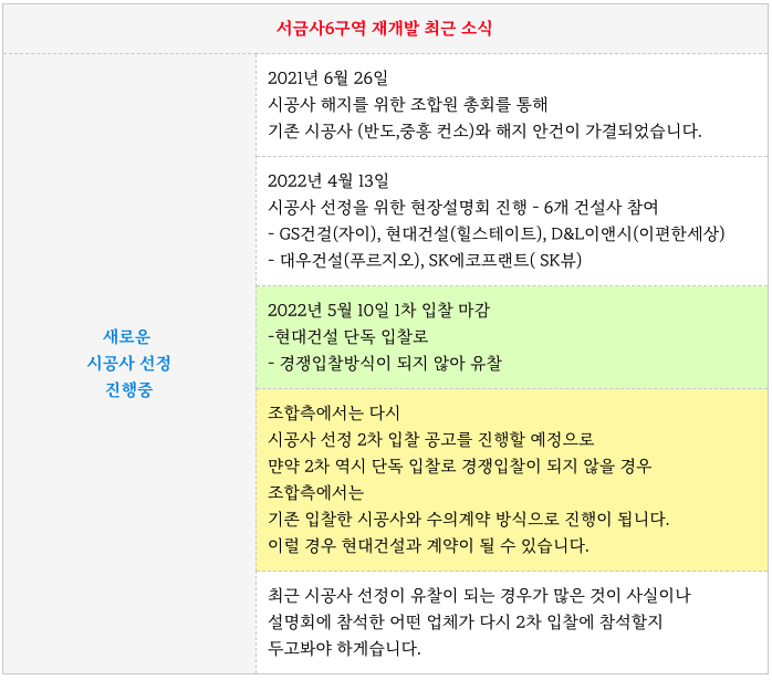 최근 새로운 시공사 선정을 위한 1차 입찰을 마감하였고 그 결과 현대 건설 단독 입찰로 경쟁 입찰이
