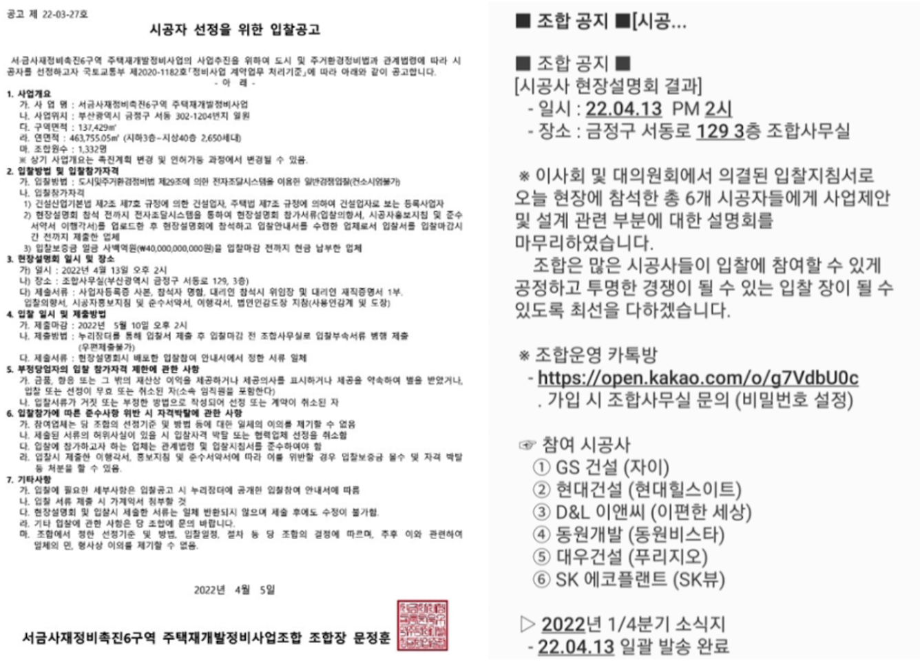 이제 조합에서는 2차 입찰 공고를 할 예정이며 2차까지 경쟁 입찰이 유찰이 되지 않기를 바라지만