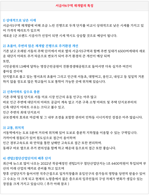서금사6구역 재개발의 특징을 간략히 정리하였습니다.