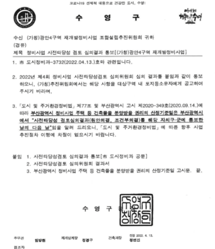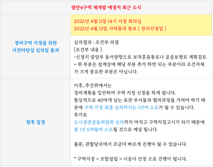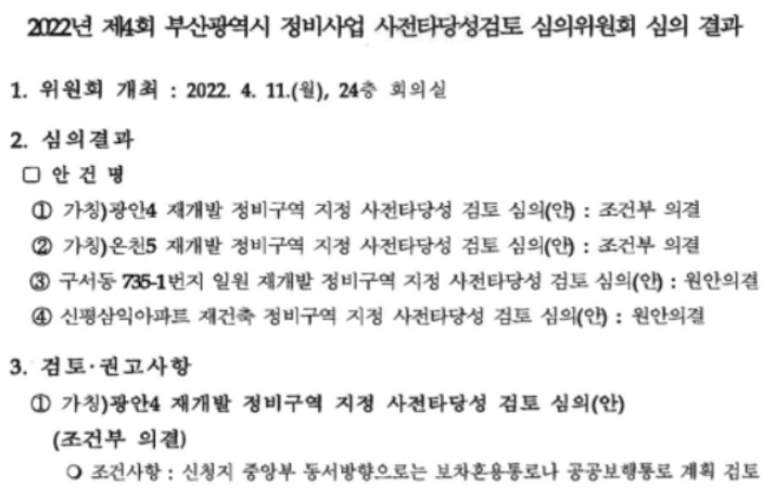 광안4구역 재개발 예정지의 최근소식은 정비구역 지정을 위한 사전타당성 심의 통과 입니다.
