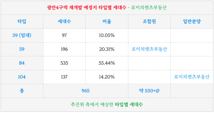 광안4구역 재개발 예정지의 타입별 세대수 입니다.