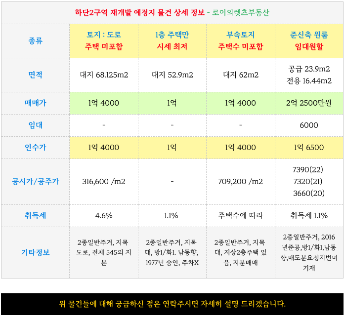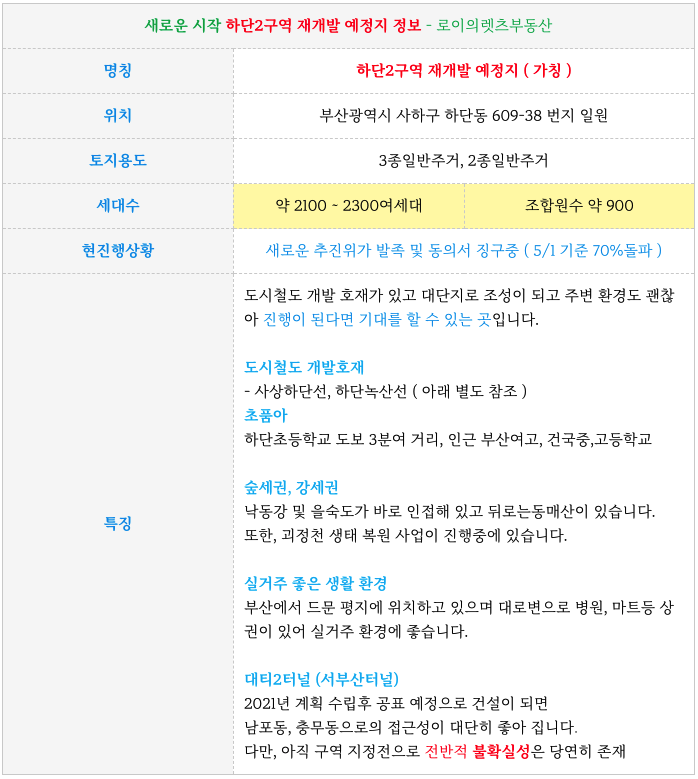 하단2구역 재개발 예정지의 물건 정보를 업데이트 하여 드리겠습니다.