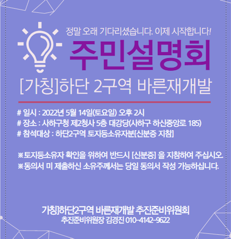 " 하단2구역 재개발 : 사업설명회 및 현동의률 " 와 작은 토지 물건등