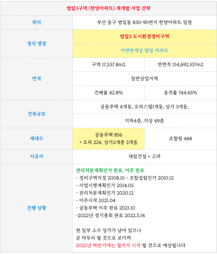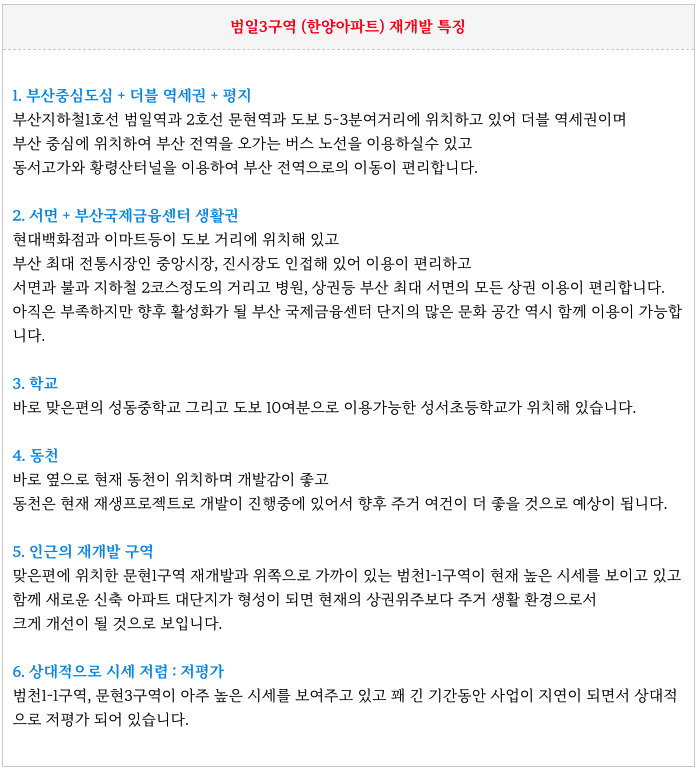 중심도심 강변아파트 범일3구역 재개발의 간략한 특징 을 다시 정리하였습니다.