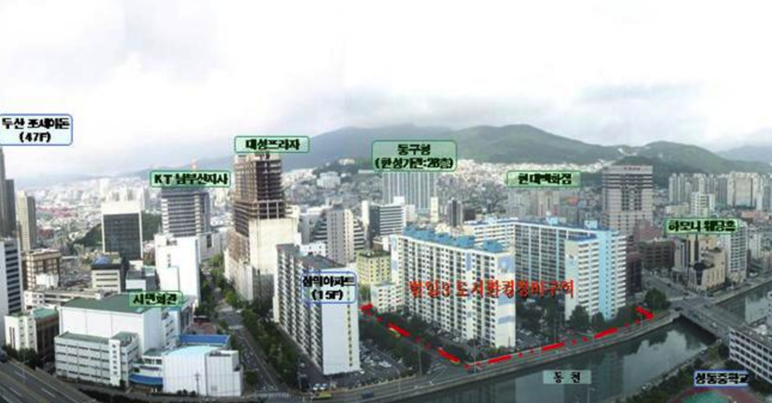 특이하게 기존 동천강옆의 한양아파트가 재건축이 아닌 도시환경정비구역으로 지정되어