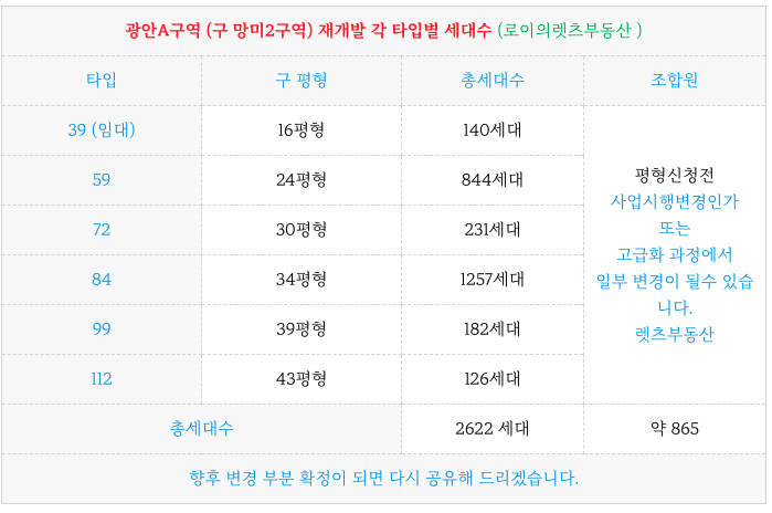 수영구 광안A구역 (구 망미2구역) 재개발의 각 타입별 세대수 입니다.