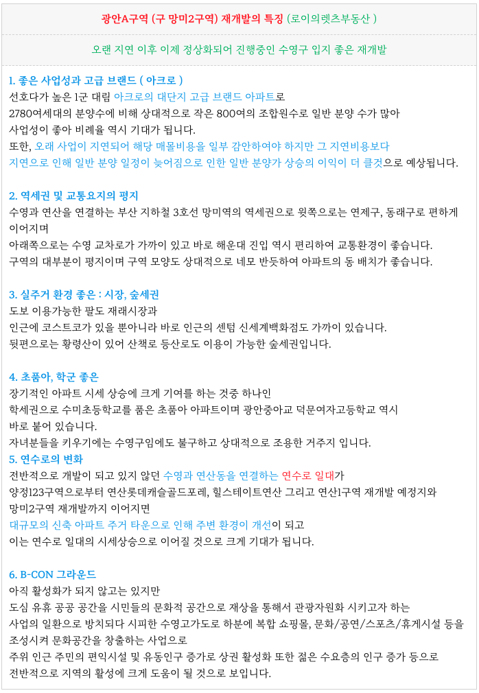 광안A구역 (구 망미2구역) 재개발의 특징과 장점을 간략하게 다시 정리해 드립니다.