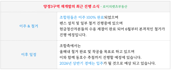 최근 이주는 완료 되었으며 일부 현금청산자 수용 재결도 완료되어 본격적인 철거가 진행될 예정이며