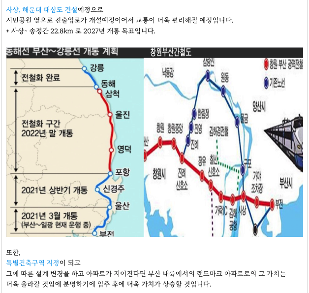 부전역 복합환승센터, 사상~해운대 대심도 등의 개발 호재가 함께 있습니다.