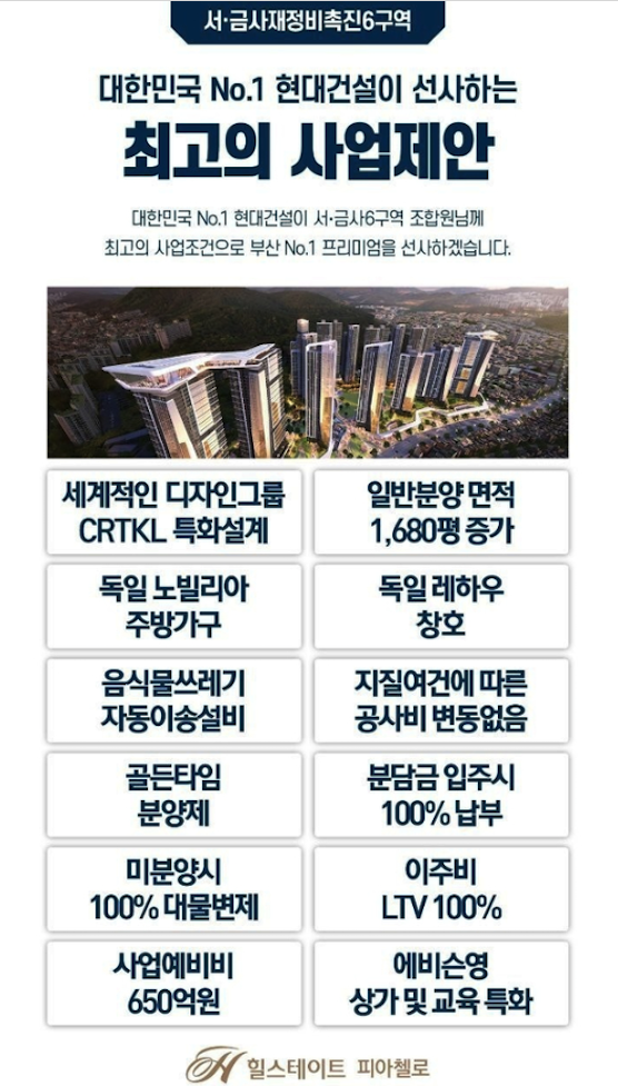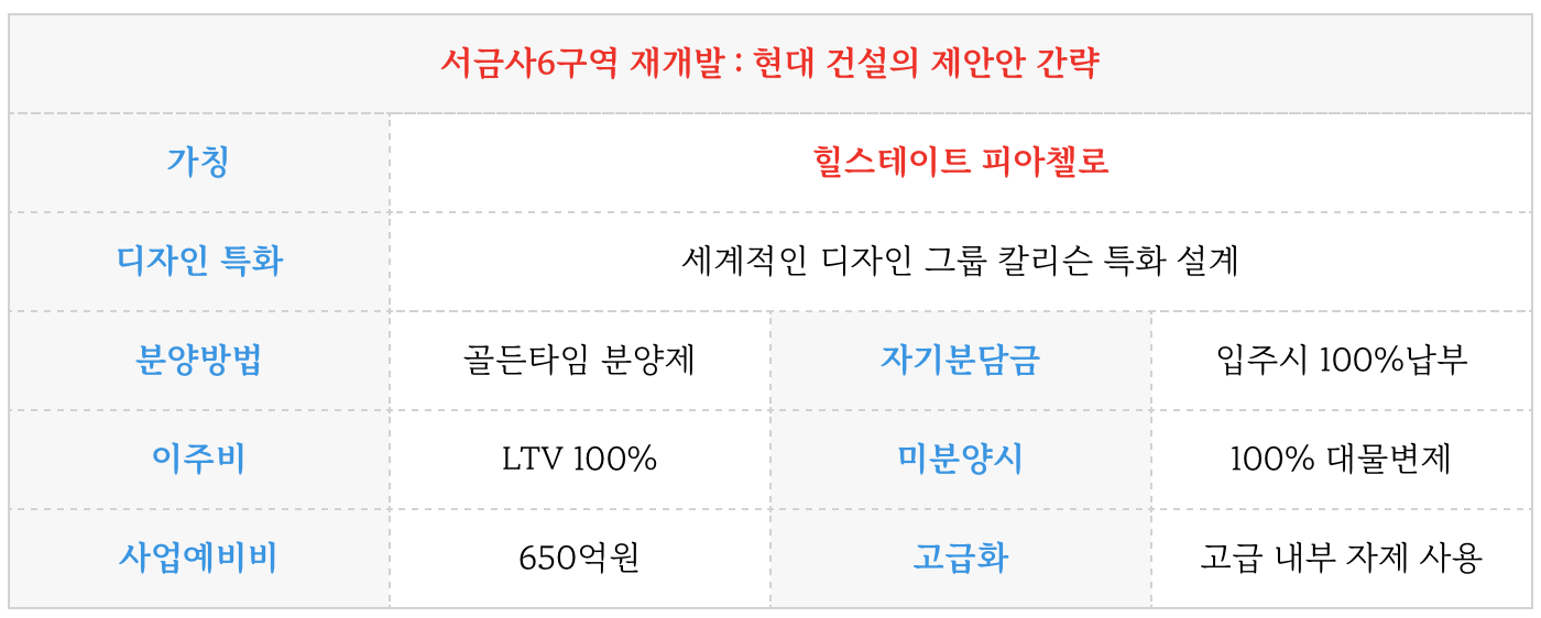 서금사6구역 재개발의 시공사로 선정될 가능성이 높아진 현대 건설의 제안내용을 간략히 보겠습니다.