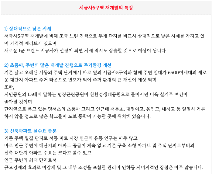 서금사6구역 재개발의 특징을 간략히 정리하였습니다.