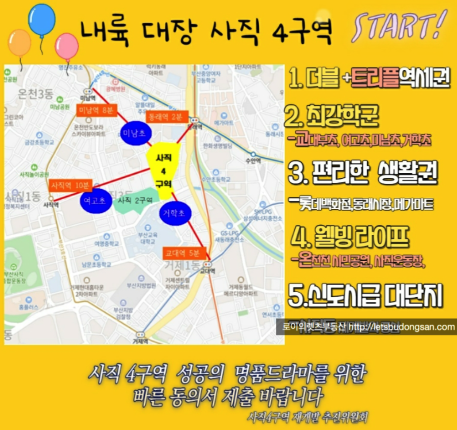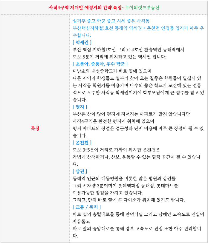 - 동래역 역세권, 초품아, 중품아, 학군좋은, 평지, 온천천, 동래 상권 등