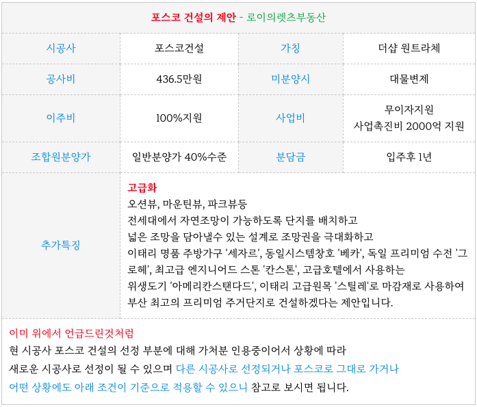 향후 시공사가 최종 확정이 되면 아래 제안 내용은 그 기준점이 될 것으로 참조하시면 되십니다..