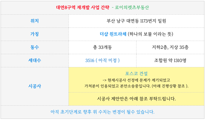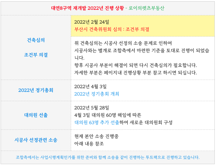 대연8구역 재개발의 현재까지의 진행상황 과 소송관련 내용등 자세한 정보는 아래 페이지를 참고 부탁드립니다.