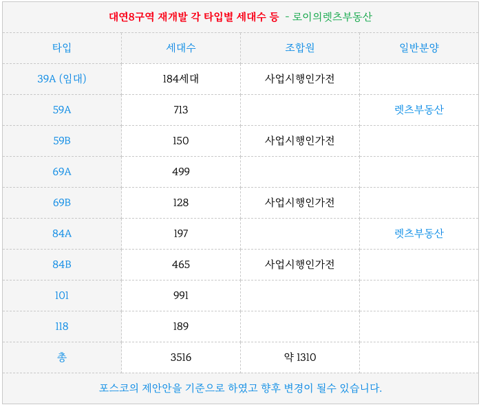 대연8구역 재개발 의 각 타입별 세대수 입니다.