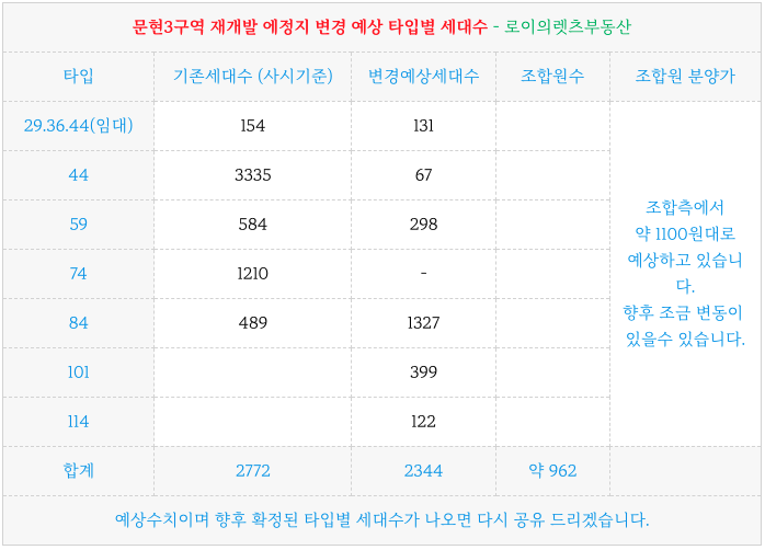 아래 수치는 변경예상수치이며 향후 확정된 변경 타입별 세대수가 나오면 다시 공유 드리겠습니다.