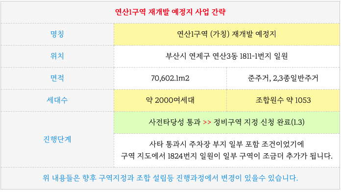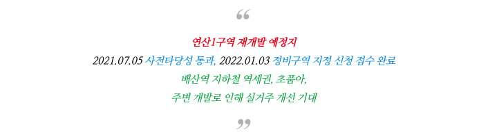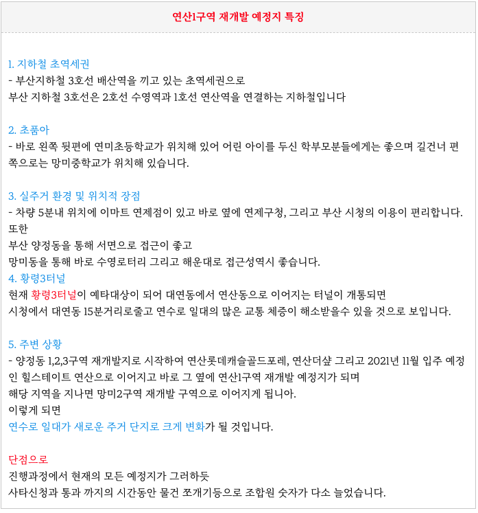 연산1구역 재개발 예정지 특징을 간략히 정리하였습니다.