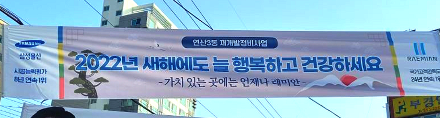 부산 최고의 선호도를 가진 삼성 래미안의 플랜카드 가 붙어서 더욱 기대감이 높아지고 있습니다