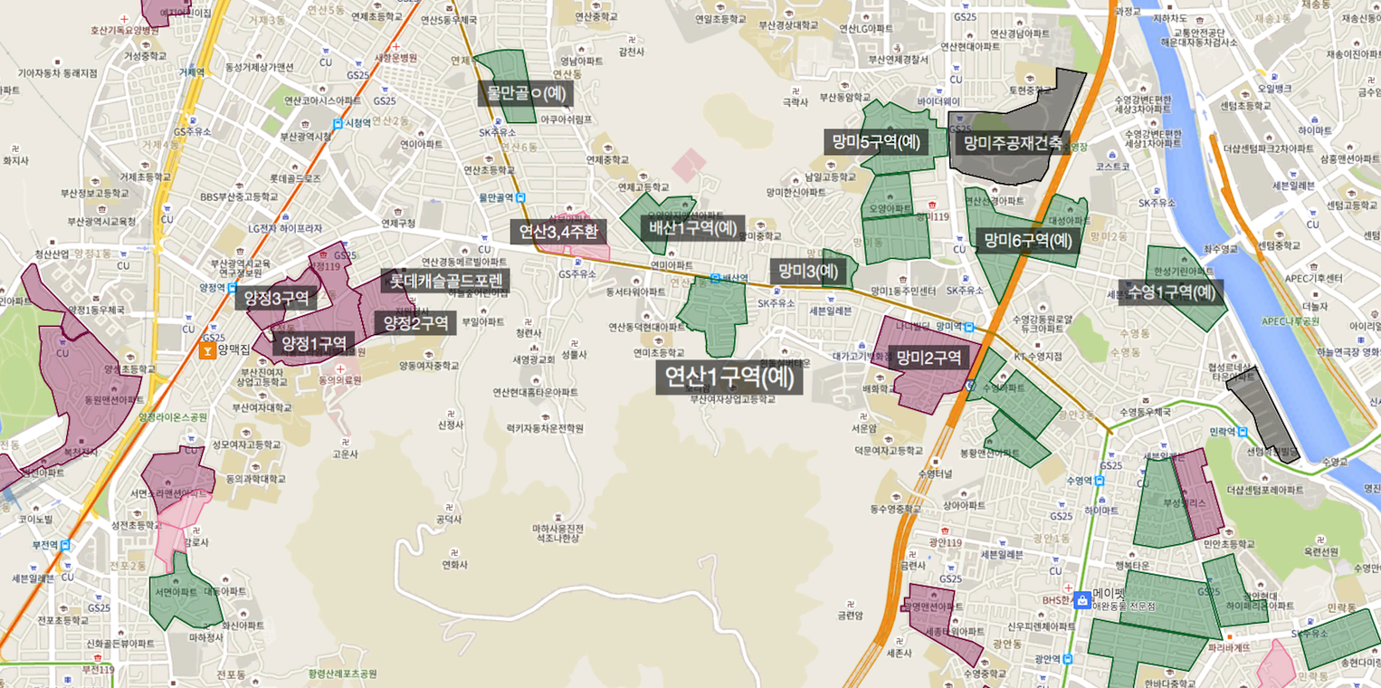양정1구역, 양정2구역, 연산롯대케슬골드포레, 연산드샵, 힐스테이트 연산, 망미2구역등으로