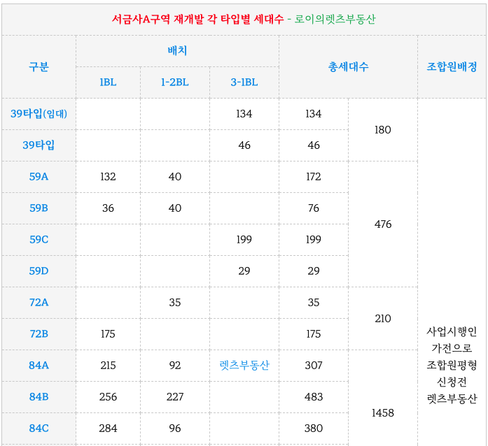 서금사A구역 재개발의 전 시공사의 타입별 세대수 입니다.
