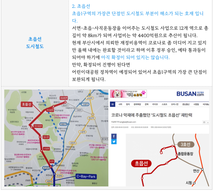 아직 미정인 초읍선도시철도는 가장 큰 단점인 지하철 비역세권을 보완해주는 개발호재들 입니다.