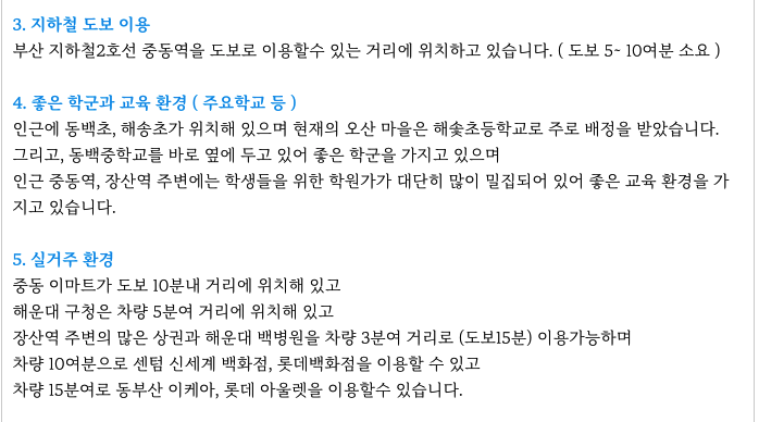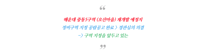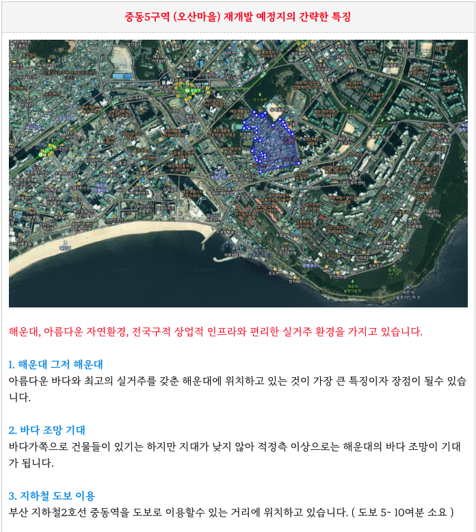 해운대 중동5구역 (오산마을) 재개발의 특징등을 간략히 정리하였습니다.