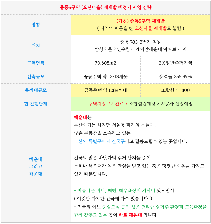 해운대 중동5구역 (오산마을) 재개발 의 진행 상황 정리등 추가 정보는 아래 페이지를 참고 부탁드립니다.