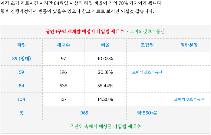 광안4구역 재개발 예정지의 추진위 예상 타입별 세대수 입니다.