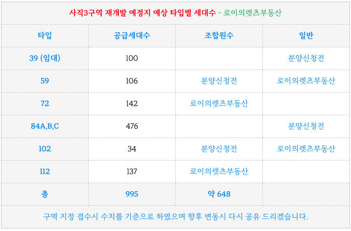 사직3구역 재개발 예정지의 예상 타입별 세대수 입니다.