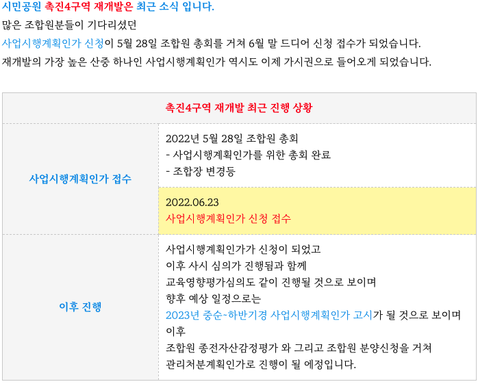 시민공원 촉진4구역 재개발의 진행 상황 정리 및 추가적인 정보는 아래 페이지를 참고부탁드립니다.
