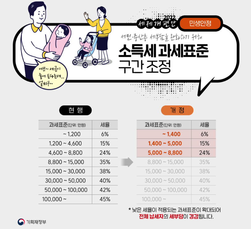 대다수의 직장 근로자에게 영향을 주는 소득세 과세 구간이 조금 조정이 되었습니다.