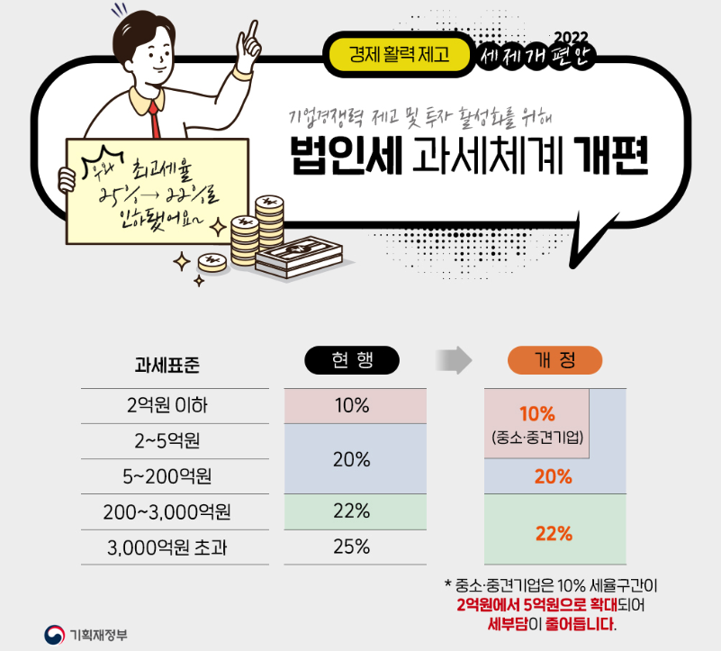 특히, 법인 역시도 세율이 줄어들어 투자에도 도움이 될 듯 합니다.