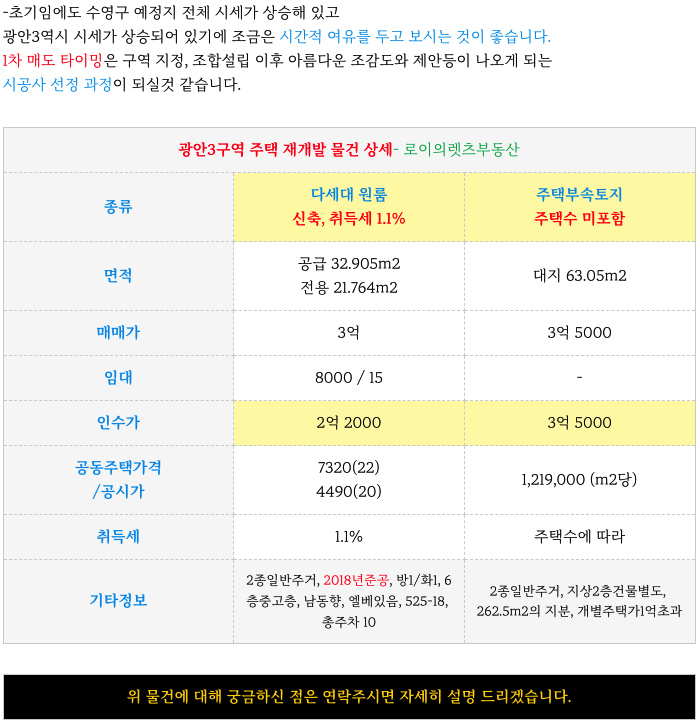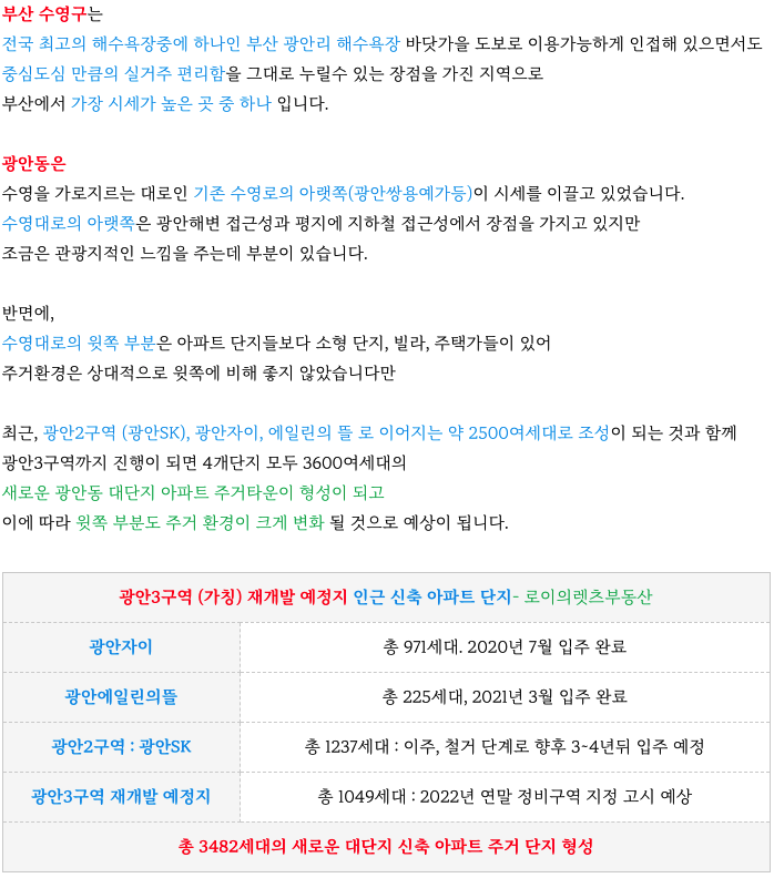 안녕하세요. 로이의렛츠부동산 (제이에이케이부동산중개법인 ) 입니다. 오늘은 수영예정지중 빠른 광안3구...