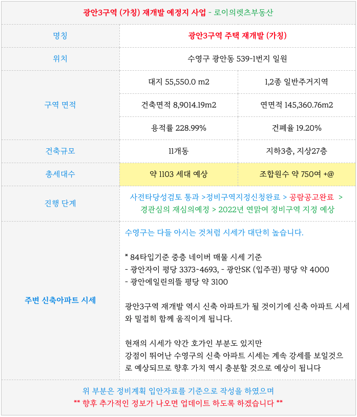 광안3구역 재개발 예정지의 현재까지의 진행상황정리등 추가 정보는 아래 페이지를 참고 부탁드립니다.