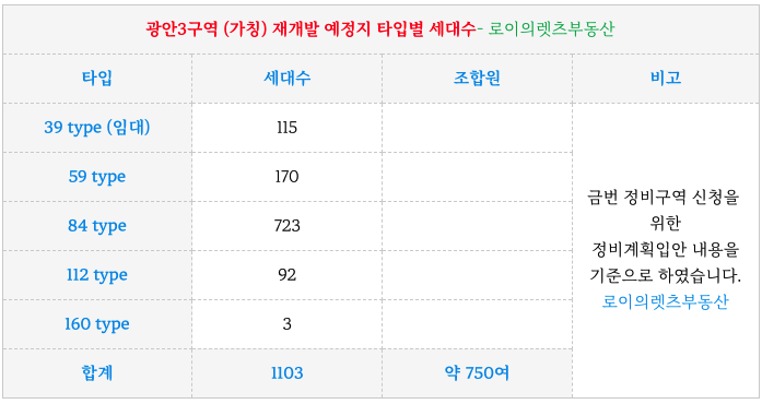 광안3구역 (가칭) 재개발 예정지 타입별 세대수는 아래와 같습니다.