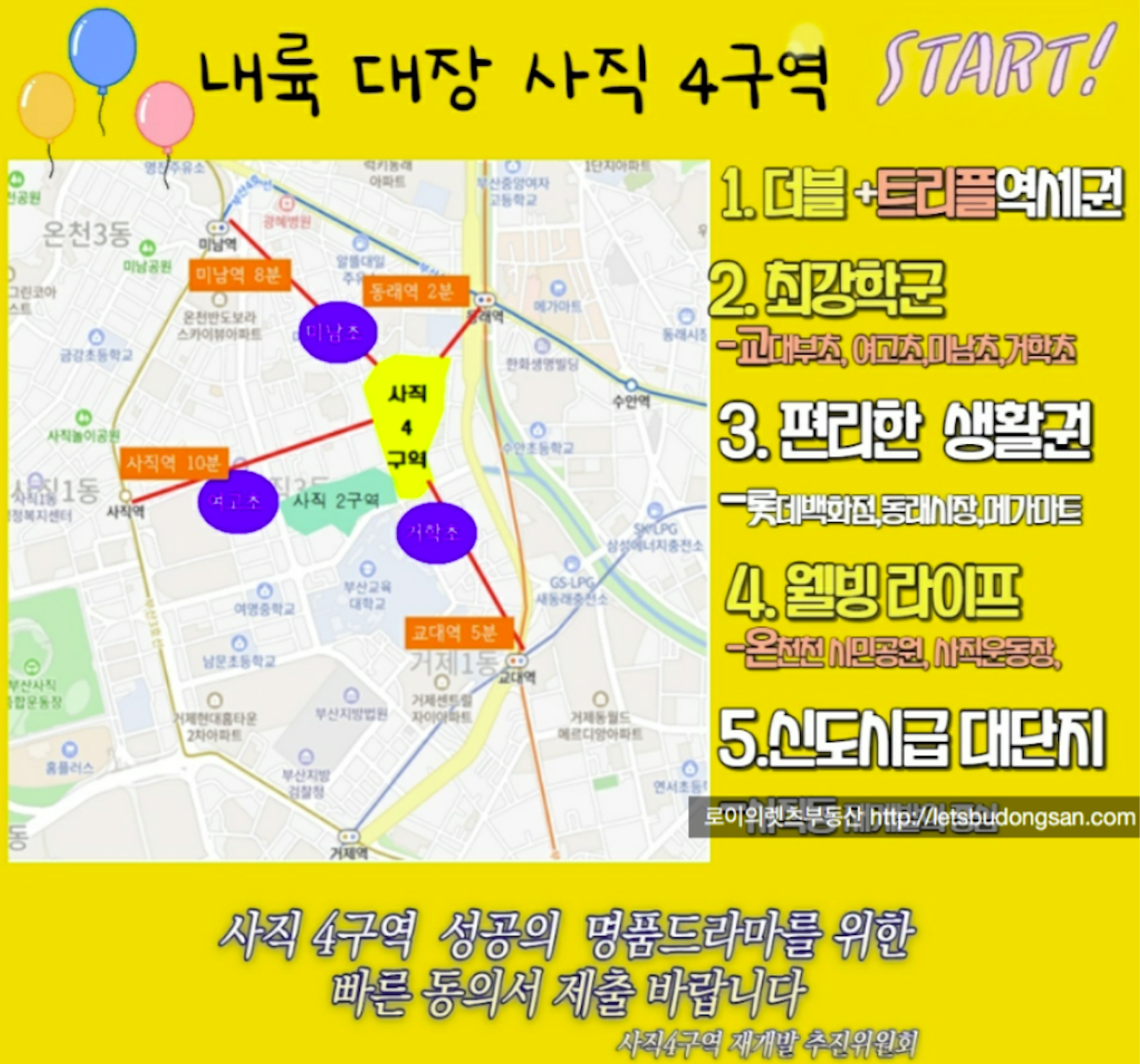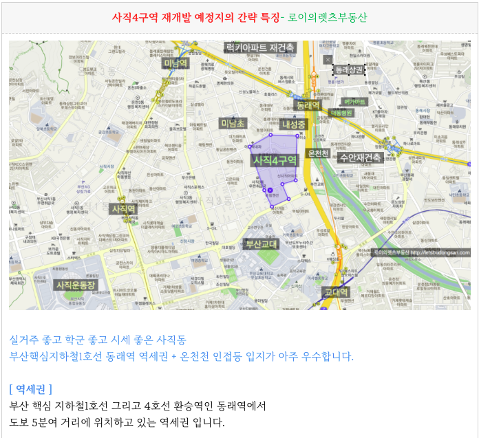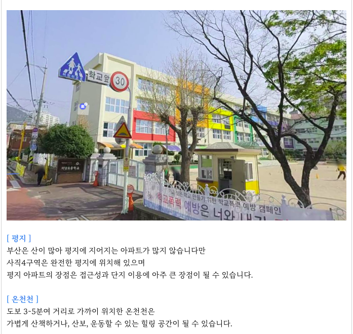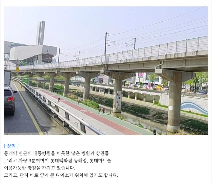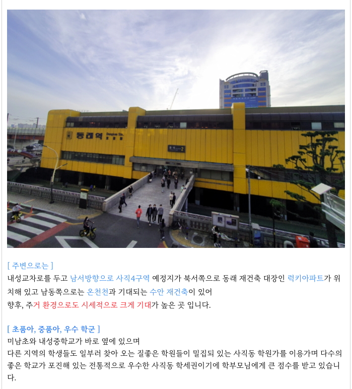 - 동래역 역세권, 초품아, 중품아, 학군좋은, 평지, 온천천, 동래 상권 등
