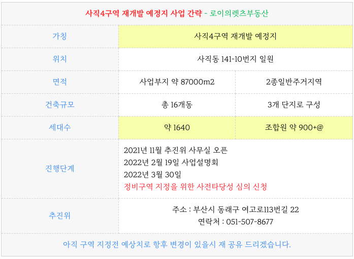 사직4구역 재개발 예정지의 추가 적인 정보는 아래 페이지를 참고 부탁드립니다.