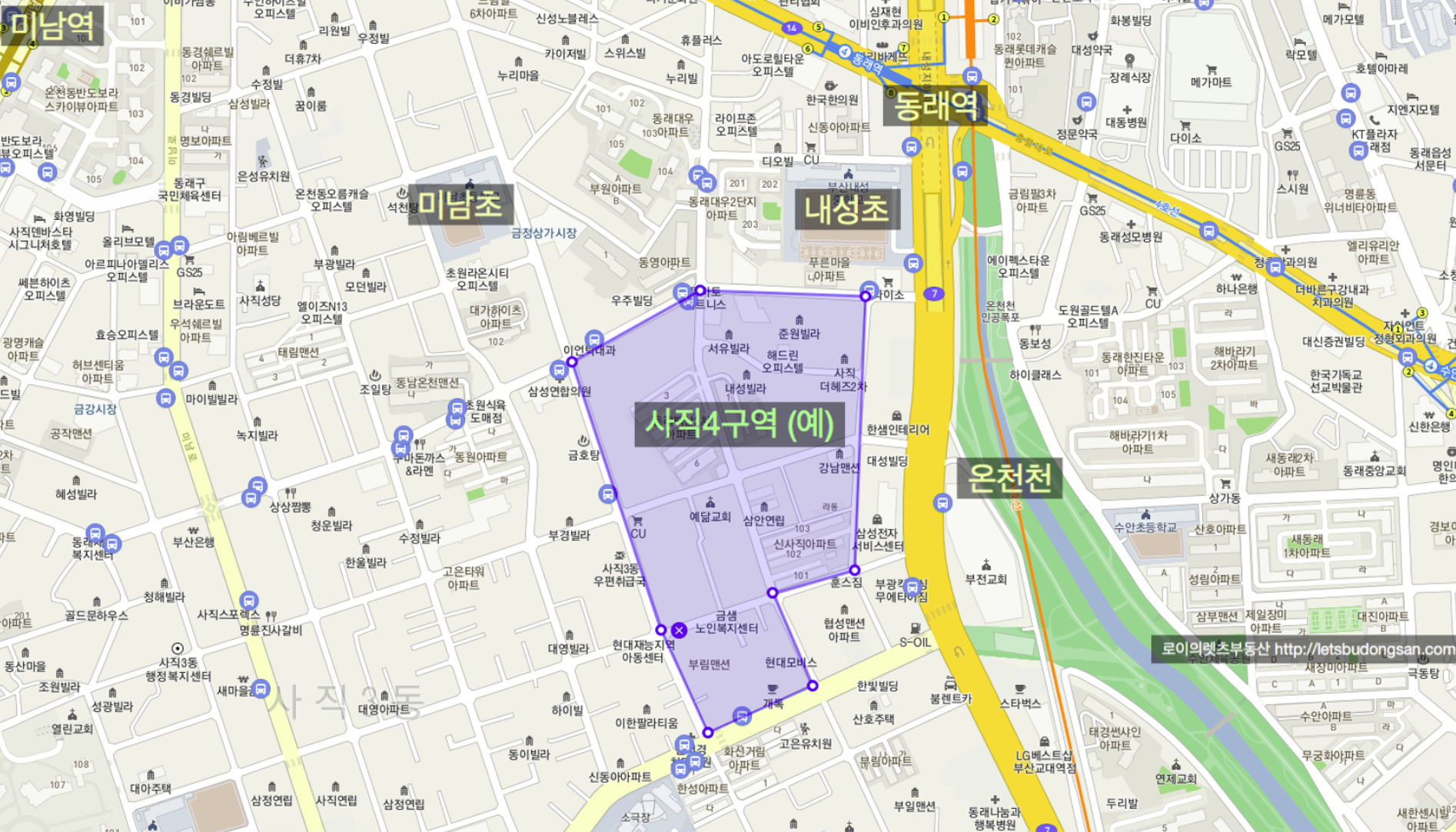 북서쪽으로 동래 재건축 대장인 럭키아파트가 위치해 있고