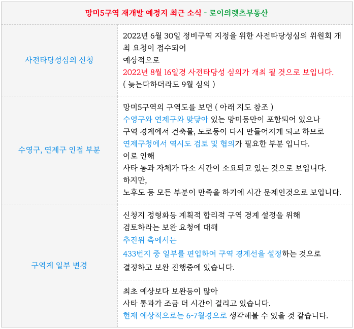 망미5구역 재개발 예정지의 현재까지의 진행상황을 정리등 추가 정보는 아래 페이지를 참고 부탁드립니다.