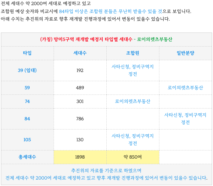 망미5구역 재개발 예정지 의 예상 타입별 세대수 입니다.