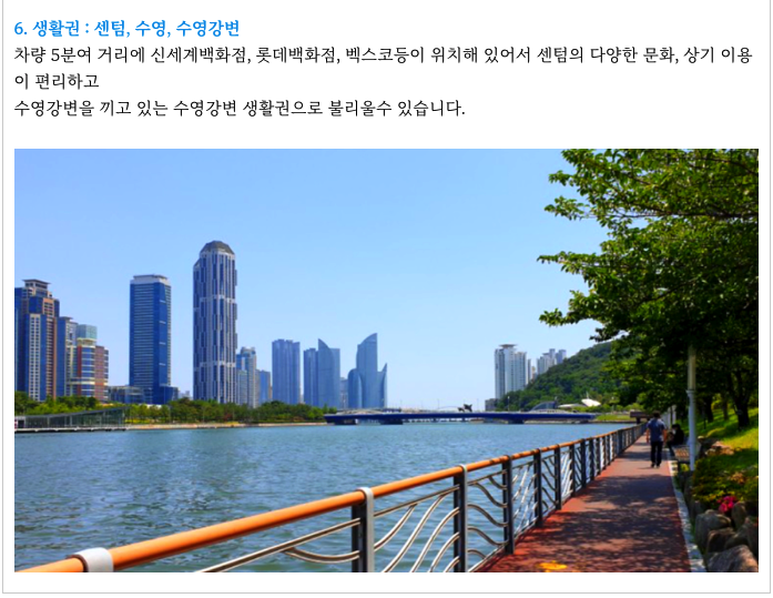 차량 5분여 거리에 센텀이 가까이 있어 백화점과 다양한 문화, 상권 시설들 이용하기도 편리하고