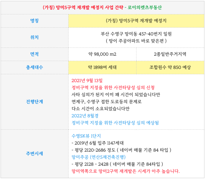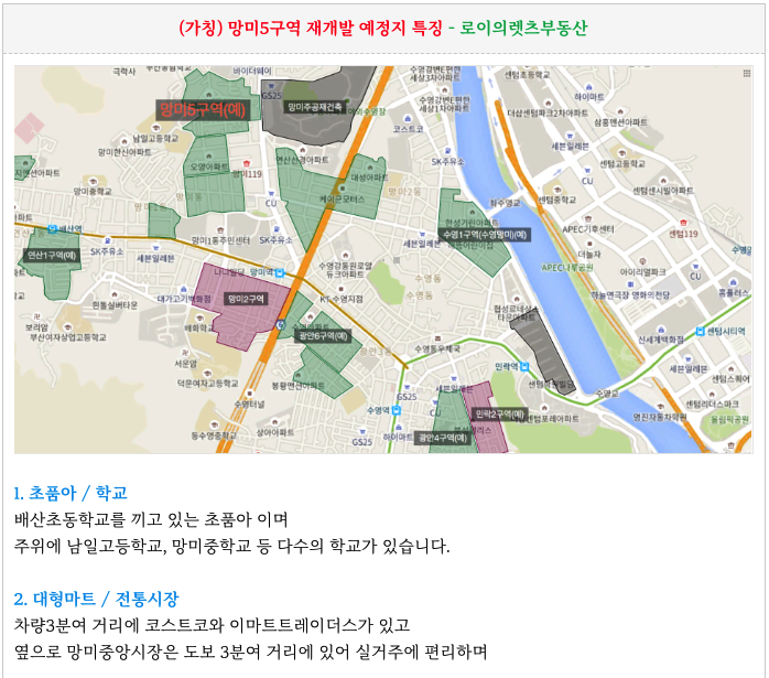 수영구 망미5구역 재개발 예정지 구역 특징을 간략히 정리 드립니다.