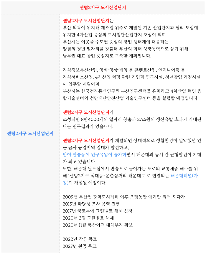 센텀2지구 도시산업단지의 내용을 간략히 정리하여 드립니다.