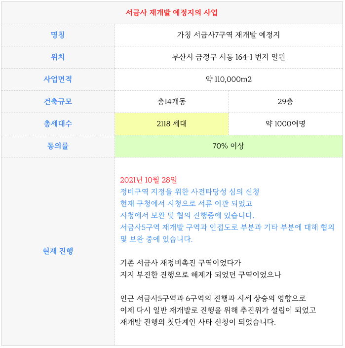 서금사7구역 재개발 예정지의 노후도등 추가 적인 정보는 아래 페이지를 참고 부탁드립니다.