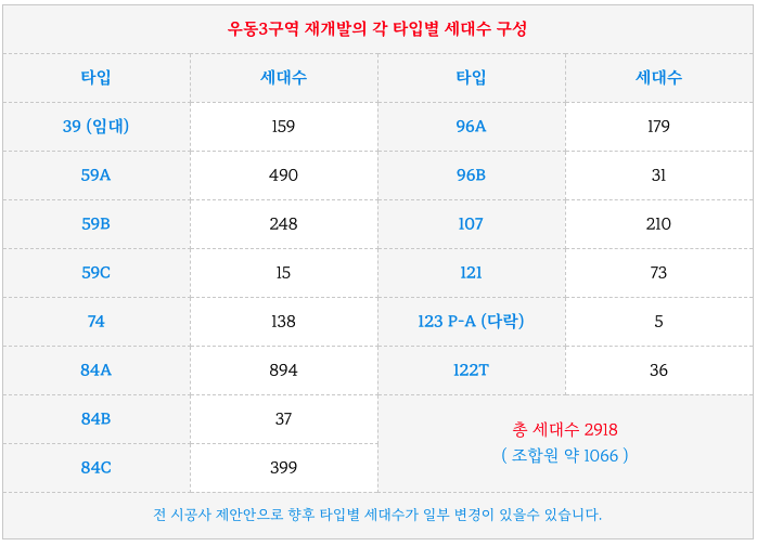 해운대 우동3구역 재개발의 타입별 세대수 입니다.