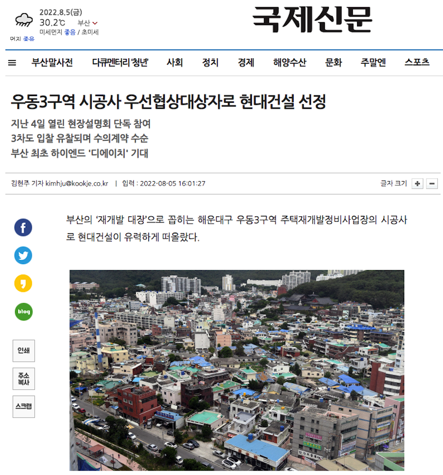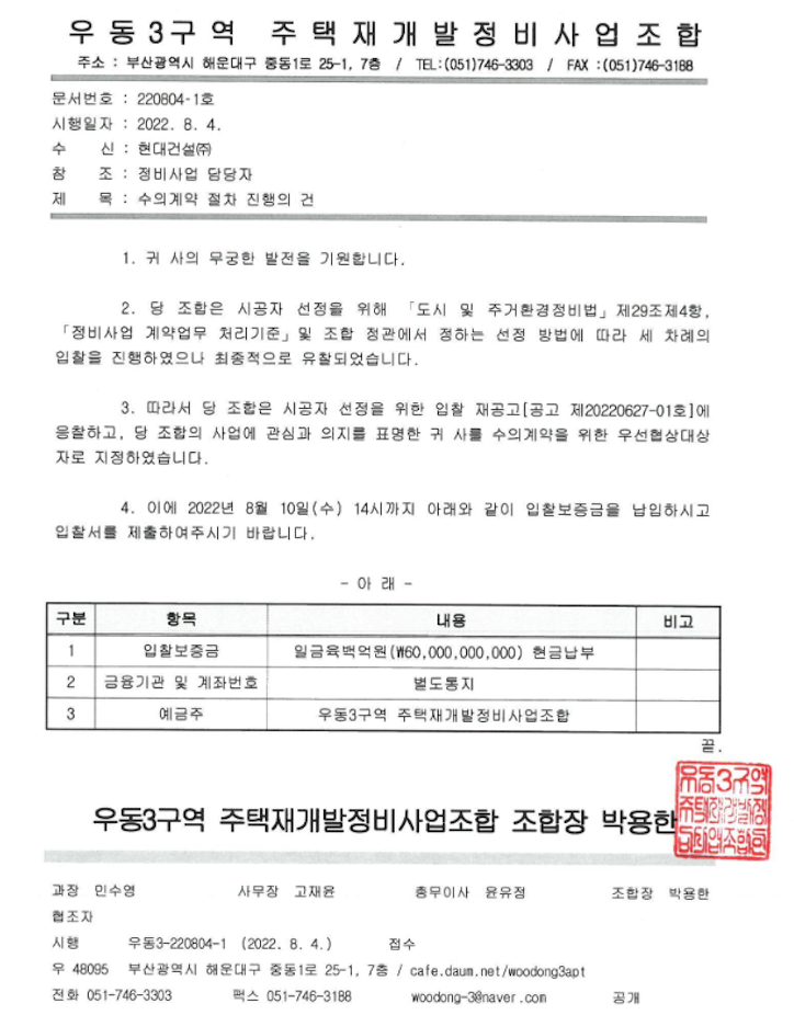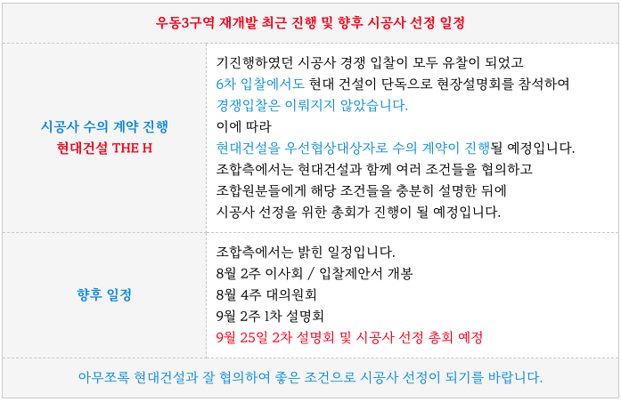 우동3구역 재개발 의 최근 소식은 현대건설 ( THE H ) 수의 계약 진행 소식 입니다.