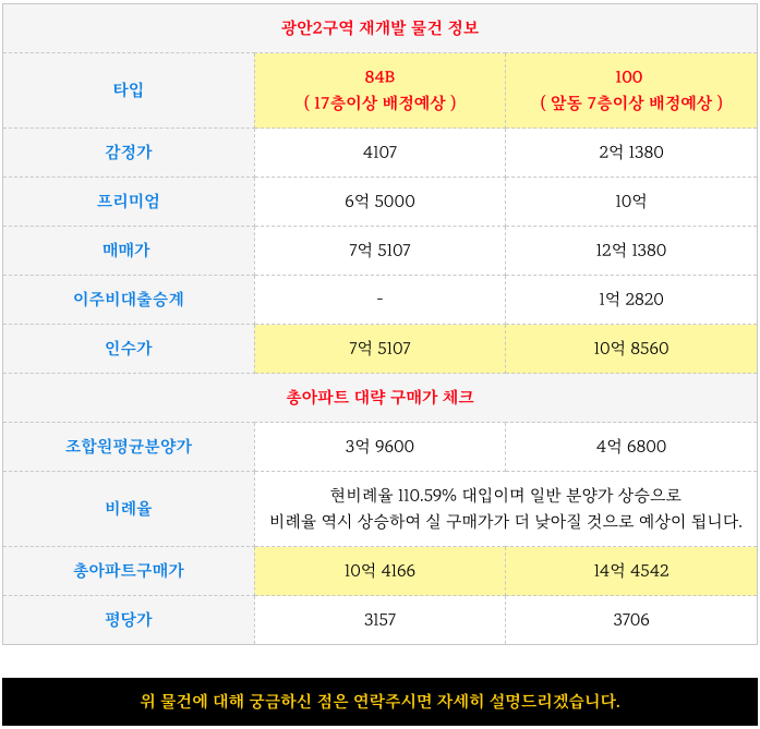 수영구 광안2구역 재개발 가격 조정되어 대단히 매력적인 100타입과 84타입 물건 소개 해 드립니다.