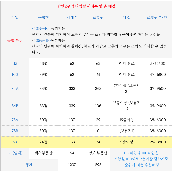 광안2구역 재개발 의 타입별 세대수와 조합원 평균 분양가입니다.