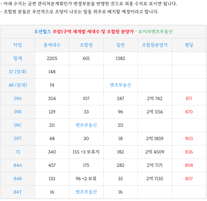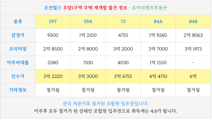 오션힐스 우암1구역 재개발 물건 의 각각 타입별 최저 물건 소개해 드리겠습니다.